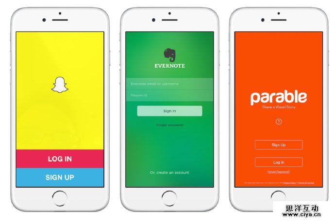 颜色方案决定了应用的形象,它应该是品牌主题色的扩展。它是视觉设计的核心,因为应用所有可见的地方都会使用这些颜色。首先,你需要选择一个能增强品牌形象的主题色。例如,Evernote的主题色是绿色。然后,你应该围绕这个主题色来创建颜色方案。亮色可以吸引人的目光,所以适合那些消费导向的应用;中间色可以让人把精力集中在信息本身,所以更适合专业性的应用。Parable的主题色是“Tangelo橙”,因此我们选择了灰度作为主要颜色方案,这也符合我们一贯的时尚创意。另一个例子是SnapChat,它使用了华丽的亮色方案来吸引青少年用户。