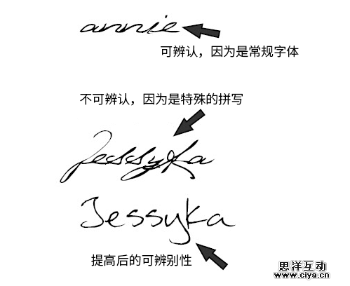 易读性、可识别性和可读性很接近,意思是,怎样更好的使用文本字体的爆发度(比如笔锋之类的 个性字体)让文本易读,比如单词,被理解认识很重要,可辨别性有一个临界点。比如,在一份简历中,你想要使用一种可以让人们容易辨认的字体来写你的姓名。可辨别性被单词中实际的每一个字母影响着。有时候一个常规字体的单词,可以很容易的辨认出来。