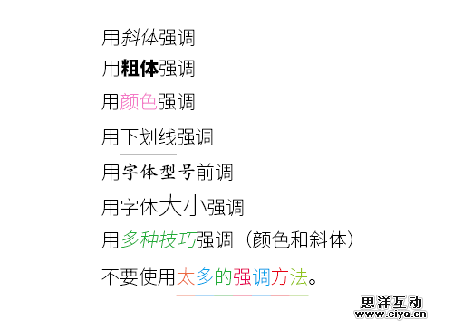 突出文本对易读性和快速浏览非常重要,一般规则是,强调文本不要超过整个文本的10%,如果所有都被强调,那就不是强调了。当然,一次仅仅使用两种或是三种强调技巧。换句话说,不要同时使用,颜色,字体改变,大小,下划线,斜体,黑体。