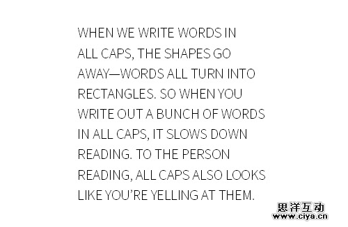 我们通过单词的形状来阅读,这就是我们大脑阅读这么快的原因,但是当我们用大写写单词的时候,这个形状就没有了——词语的形状全都变成了矩形,因此当你写出一段大写的单词的时候,它减慢了阅读速度。对于读者,全部都是大写就像是你在朝他们怒吼一样。