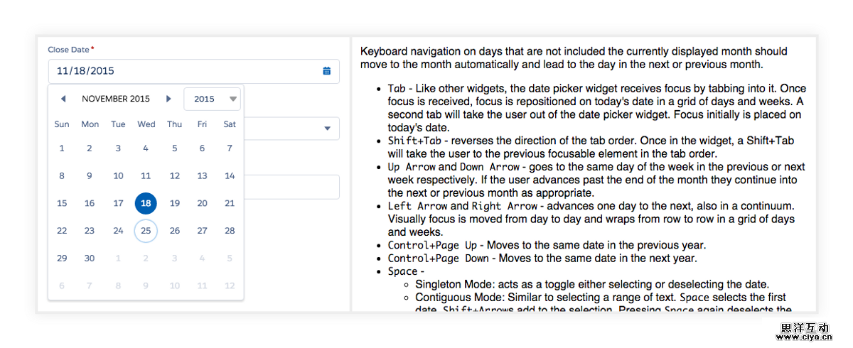 在设计新的Lightning Experience 的时候,我们对于它的可访问性设计就有一个基本的构想。由于键盘输入还是目前我们用户的主要输入方式(考虑到我们这是一个企业级软件),所以一定要对键盘有良好的兼容和适配,必须确保用户仅用键盘就可以执行全部的操作。为此,我们为每个表单组件建立了特定的键盘交互模式,而且这些模式的构建是遵循W3C的规则来设计的,这也确保了这套交互的准确和广泛的适配性。
