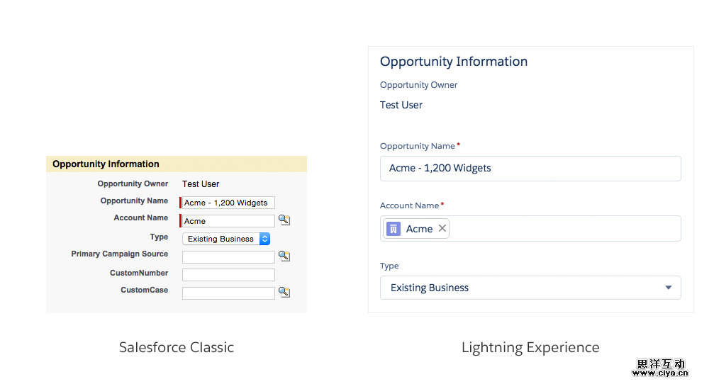 在Lightning 中,表单里的标签和它所对应的输入字段是一起左对齐的,并且标签处于输入框的上方。这种设计方式可以让用户操作更加省心高效,和之前的版本相比,用户在浏览和操作的时候,只需要进行上下眼动就可以搞定一切,无需左右扫视。