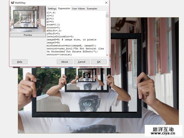 之后进入Expression界面,将原有的默认代码删除,粘贴上Droste Effect代码,点击预览(Preview)按钮(记住不要将顺序搞错了,不然会卡住!!!)
