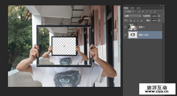 2. 将原来图层复制一份,副本放在原来图层下,Ctrl + T变形,按下Alt+Shift可以以中心按比例缩小,调节好大小后,回车确定。