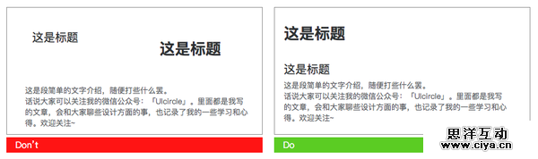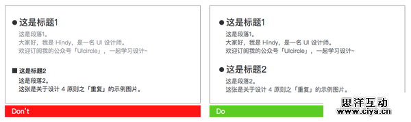 重复不一定是某种视觉元素的重复,也可以是文字样式的重复。左图存在的问题就是两个标题、段落的样式都不一样,感觉非常「凌乱」。右图将文字字号、颜色等作了统一,看上去就有秩序多了。