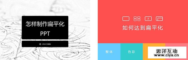 我们看下这两张有什么问题。首先最明显的就是色彩主题不统一。封面是黑白,但后面的内容页却使用了彩色的大色块。另外封面的背景有些不明所以,还干扰了标题这个重点。而大标题将 PPT 三个字单独一行也不妥,阅读(瞟)起来有断裂感。然后像内页里「如何达到扁平化」上方的图标也是多余元素,我仔细推敲才发现可能是为了对应下方的「四个设计要点」?
