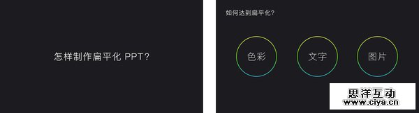 可以看到,我使用深色背景,去掉多余元素后,「高端」的感觉立马起来了。但是在使用「黑色」作背景的时候,可以不用纯黑,因为那样会显得单调死气,可以适当加入一些色彩的纯度。然后仔细观察右图的修改,可以看到我将「色彩」、「文字」、「图片」字体放大,视觉上比标题「如何达到扁平化」更重,而原图则相反。这是因为通常下面的内容才是重点,标题提问只是为了引出下面的回答。而原图的第一视觉中心却是那个问题,有点错误理解了内容的重要性。
