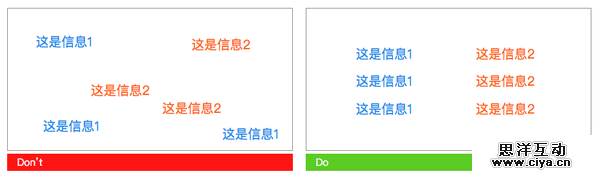 左图是非常酷的随机排序咳咳,虽然很酷,但我们却无从知晓到底该从哪开始阅读。当我们需要展示某些信息的时候,需要像右图那样,认真将内容组织排序、对齐。相近的元素要相互靠近,不管是视觉上相近还是内容上相近。