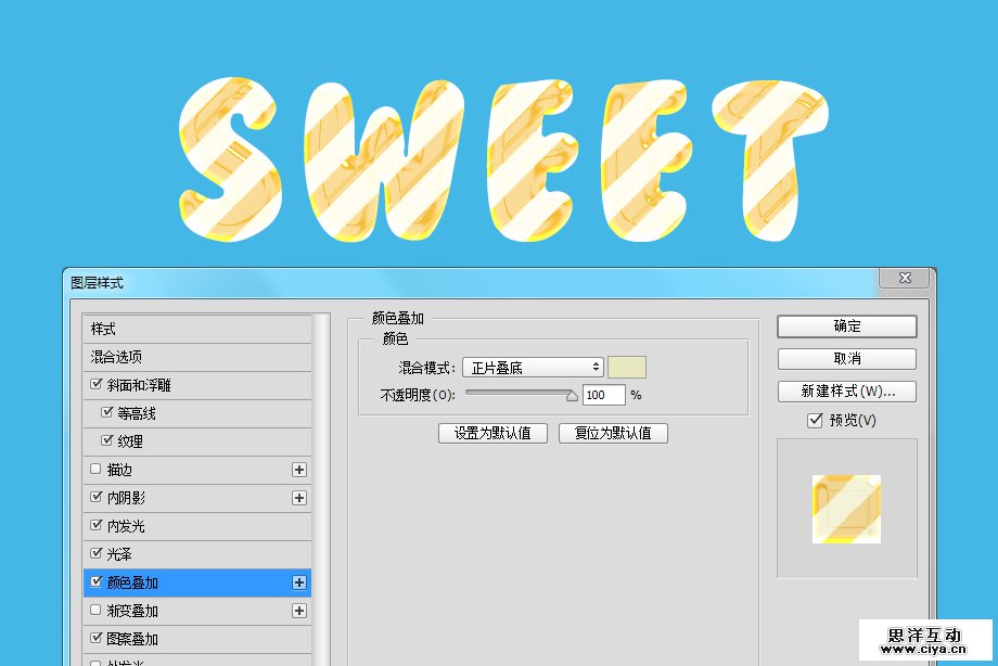 由于在这里,我们看到文字经过几次高光的影响纹理的细节不够清晰,这时,我们就需要让细节更凸出,做法就是应用上“颜色叠加”,叠加的混合模式变为“正片叠底”,目的是为了让细节凸显出来,但又不至于太过暗淡。