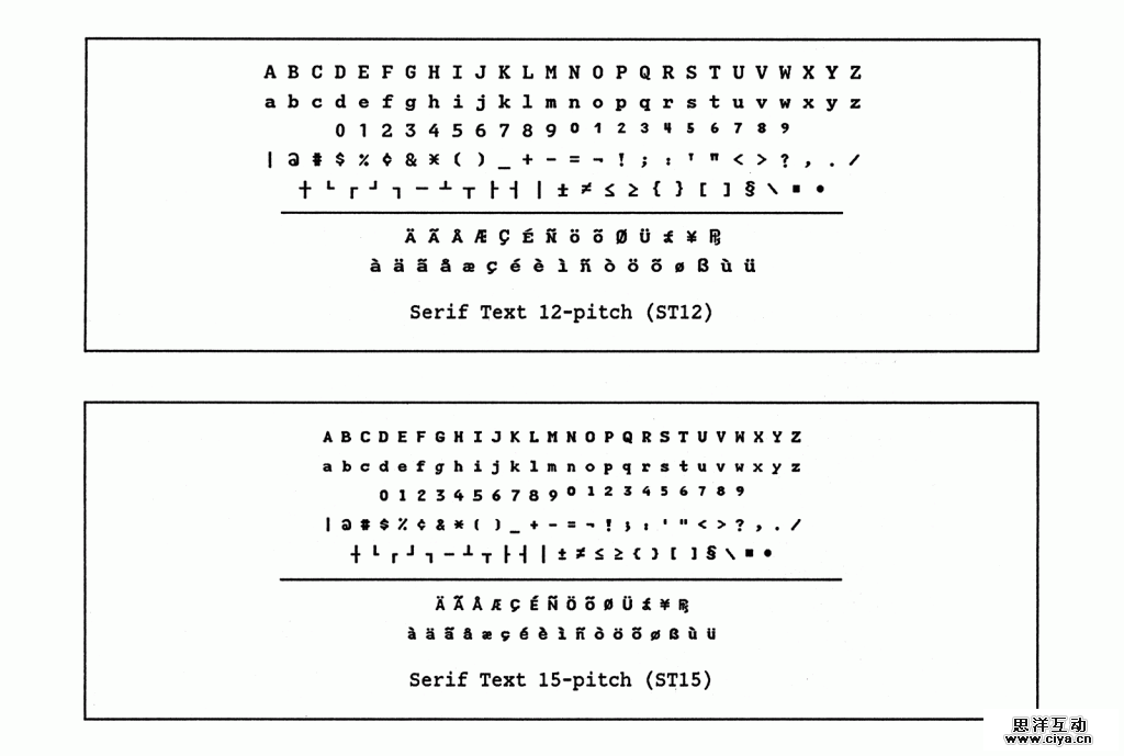 另外,3800-3 还内建了其他的字体(很可能是 IBM 自制的)。为了在等宽字的空间里塞进比塞塔货币符号(Pts)而把 P 与 t 合体的设计等等,看得到很多设计上的苦心。Ç と ç 为了放得下软音符,有把字稍微抬高。另外 Script 的设计太优秀了,以等宽字来说算是做得非常漂亮的。好想看到这些字的点阵资料……