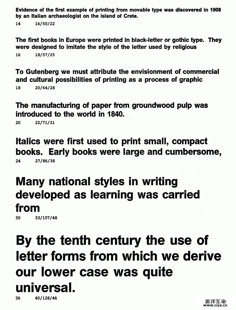 Serif 与 Sans 一样,在不同的文字尺寸,设计都有大幅的差异,而 Serif 又特别明显。在较小的尺寸,字间取得比较宽,线条比较没有对比,x-height 比较高,即使是 6pt 也可以清晰阅读(以前没看过这种造型的 Times New Roman,非常新鲜)。