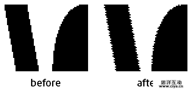 虽说是点阵数据,最后的输出设备是打印机。与平常我们在计算机画面、平版印刷上能看到清晰的每个点不同,因为输出时使用的是粉末状的碳粉,所以轮廓的形状无论如何就是会显得模糊。Sonoran 系列字体反而将这点视为特色,以跳动的方式描绘轮廓线,让外框显得柔和。可惜的是我手边找不到原始图了,下面这张图是示意图: