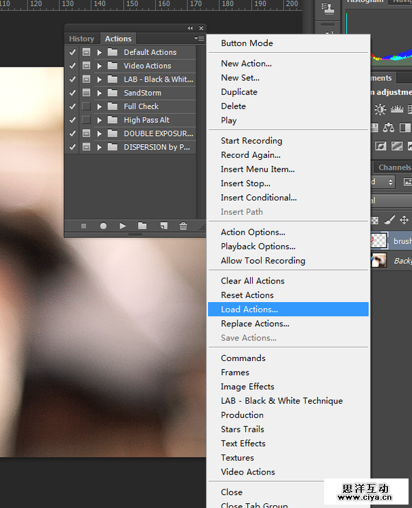 这一步开始导入动作,alt+f9快捷键导出动作面板,点击该面板右上角位置的小图标,出现上列表,按Load actions,打开所下载的动作文件,按照PS版本载入动作。