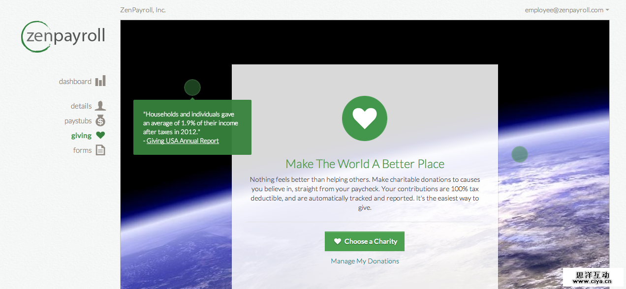 ZenPayroll Giving将账单上常规的自动扣款与慈善捐赠联系起来,这让捐赠变得超简单。捐赠记录也会自动的在年末记录在员工的工资收入表上。用户再也不用担心进行慈善捐赠很麻烦了。