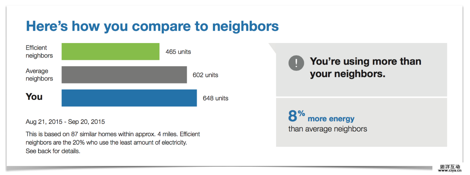 Opower采用社交攀比大法去鼓励数百万个家庭减少他们的能源消耗—产品会展示他们用了多少能源以及同区域的别的家庭用了多少。虽然人们通常不会就能源使用想太多,但“人比人”还是蛮有效的,促使人们重新考虑他们的能源使用习惯,并想方设法用更少,排名更好。