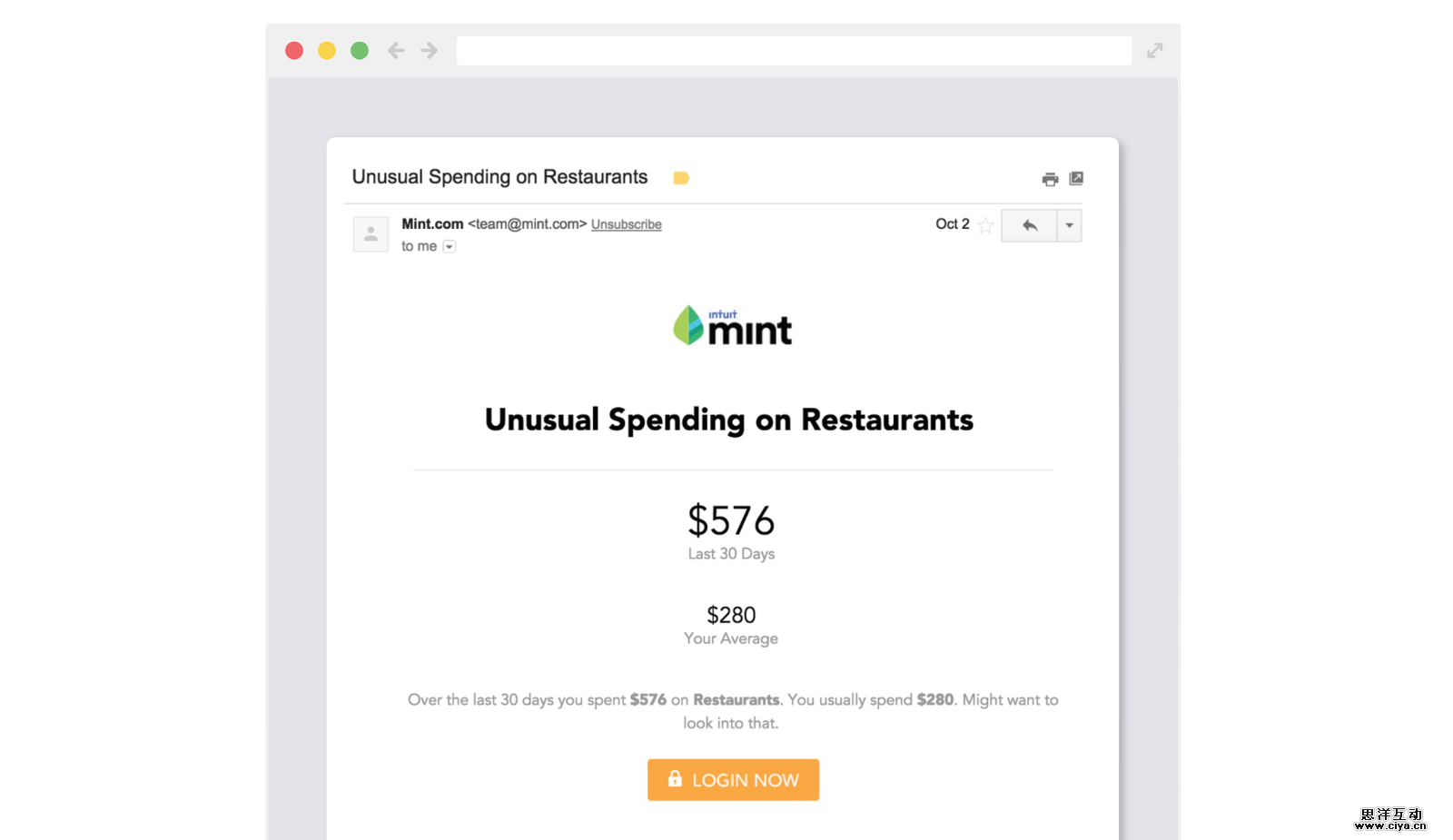 Mint会发邮件提醒用户一些消费异常的情况,这总是毫无意外的能赢得用户的注意,因为邮件内容和用户自身的利益息息相关——(收到提醒这件事)是不可预期的惊喜(当然也有可能是个惊吓),不管怎样,都会吸引用户回产品中去进一步“调查”一下。
