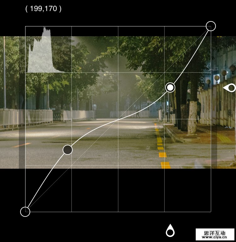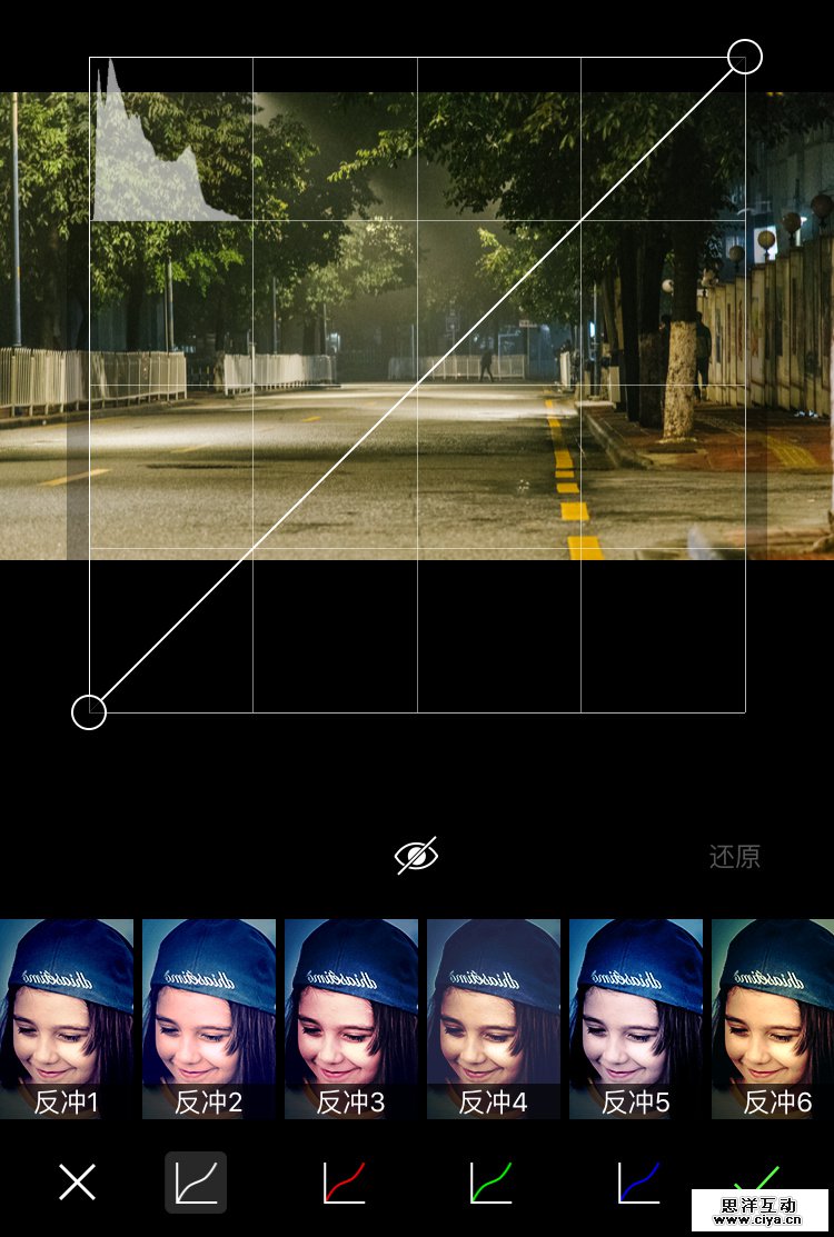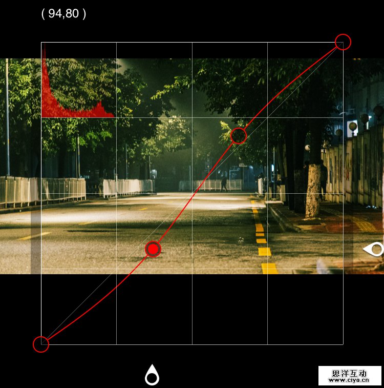 调节曲线后背景的照片可以实时预览,这点还是不错的,十六宫格左上角有个色阶图简单提示了图片的信息,这里我不做详细展开,只简单介绍下,色阶左侧是黑(暗)右侧是白,一张曝光均衡的照片它的色阶应该是比较均匀的,如果画面欠曝,或者出现死黑现象,色阶的左侧就会很多或溢出,反之如果过曝,色阶右侧就会就较多信息。
