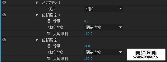 步骤2:给形状图层添加[合并路径],模式为“相加”。然后再添加两个[位移路径],线段连接改成“圆角连接”,上面的数量的绝对值和下面的数量的绝对值要一样,并且一正一负,正的在上,负的在下。