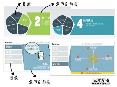 所谓引导页,目的是在一章结束,下一章开始前,让听众有喘息的空间,也给演讲人一个互动的机会。我喜欢把目录页和引导页做到一起。