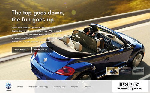 下面的这个设计案例,将视线集中在作为商品的汽车上,通过利用模糊效果,将品牌形象中的乐趣和速度感表现出来。通过另一个相同的设计案例我们可以看到,模糊效果可以将排版的空间感给彰显出来。