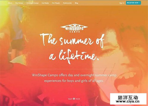 下面的这个设计案例,将夏令营的氛围通过视觉传递出来了。首先以橙色为中心,通过使用暖色来联想到夏天,将照片添加上模糊的效果,将夏天美好的回忆给引出来,将主题The Sumer of A Lifetime很好的表现了出来。