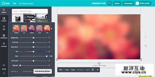 在实践的样本中试试看,将学到的这些技术,运用到自己的设计之中吧。利用Canva ,要先注册才能使用,如果嫌麻烦可以试试PS里的模糊效果,也很不错呢。这个网络工具,可以十分简单的给你的照片添加上模糊效果。首先,让我们来选择照片吧。(上传你自己喜欢的照片,或者从网站中选择免费的照片。)