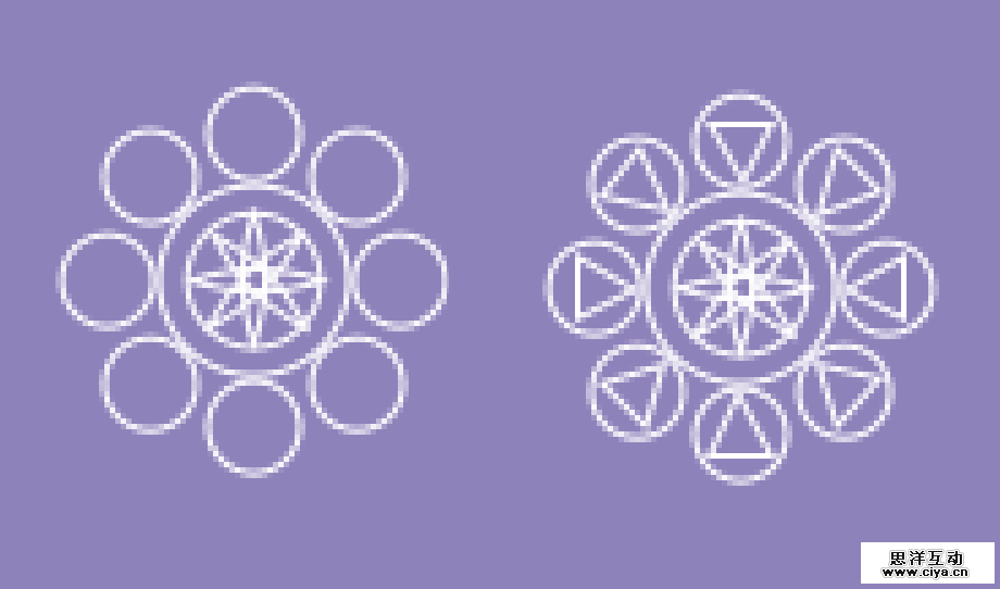 在圆的外部再用小圆组合围绕,你可以先画一个圆,再对称放一个圆,然后把这个两个圆旋转30度,这样重复这一步骤就能形成围绕的图形。然后用同样的方式画三角形。三角形的锚点对齐像素网格。