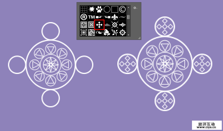 中型的图案比小型图案稍微复杂,因此我们用了PS自带的一个矢量图形作为中心。图形依然是保持空白填充,白色描边1px。