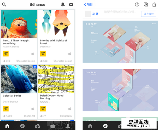 Behance 是展示和发现创意作品的领先在线平台,同时也是 Adobe 系列的一部分。 相对来说 Dribbble 上更多的是设计师的个人练习,强调的更多的是技法和设计本身,而 Behance 上有更多的商业作品,不少设计师会分享整个项目的设计流程,以及一些阶段性的 demo。就像一位大神所说,如果 Dribbble 是设计师的厨房,那么 Behance 则是设计师的客厅。