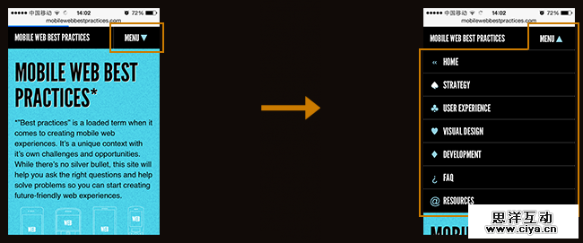 ·容易辨认——选择菜单贴有明确的标签,显示“导航”或“菜单”,这非常容易辨认。