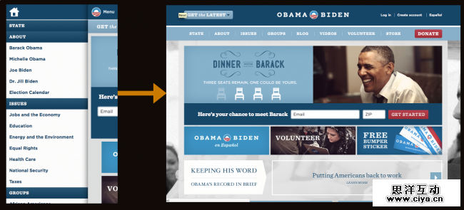 ·高级——当其它方法只需要修改简单的元素,而这个方法却有很多需要移动的部件。正如斯蒂芬妮·里格尔指出,奥巴马的网站导航打破了一切, 除了最尖端的设备。如果你的项目是为一个更广泛的受众,而你选择了这种方法,你要非常小心。