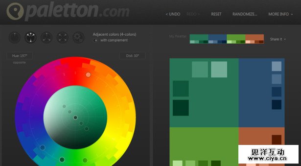 Paletton是我个人最喜欢的,因为它提供了一系列基于调整饱和度的相对色。它还提供了基于你所选择的颜色,相同的颜色范围的预设方案。最重要的是,它是完全免费的!