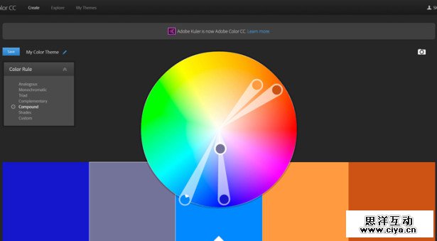 另一个流行的选择是Adobe Color,它有非常相似的设置,但界面有些复杂。你依然需要基于输入一个单色,来选择配色方案。不过Adobe Color使用色轮展示匹配的颜,每一种颜色是灵活的,易于移动的,在维持颜色模式一致性之内。
