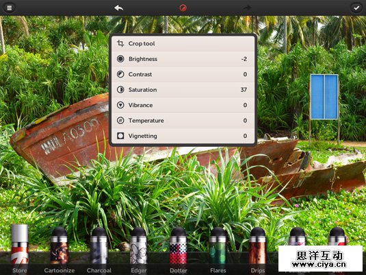 屏幕底部的有九个不同艺术效果的刷子的选择,它们有的是色调分离的效果,或者炭笔等艺术效果,或者更有创意的网格效果或水墨效果。它还有橡皮擦和撤销工具,让你可以随心所欲处理你的图片。