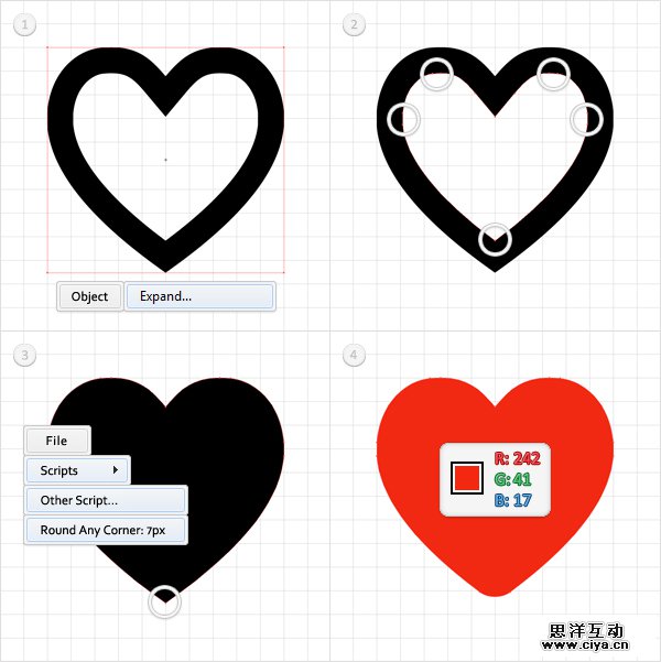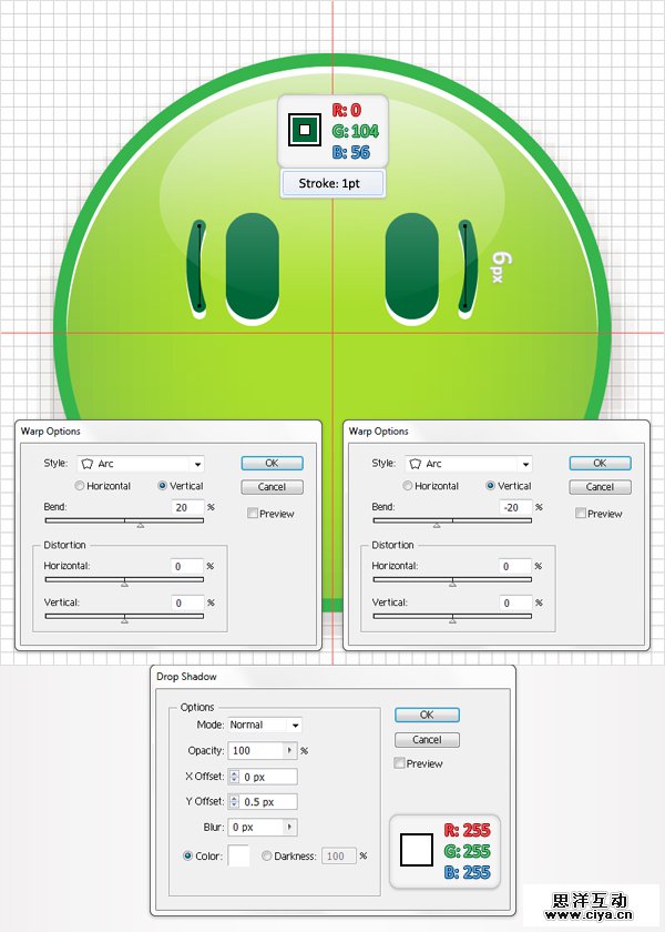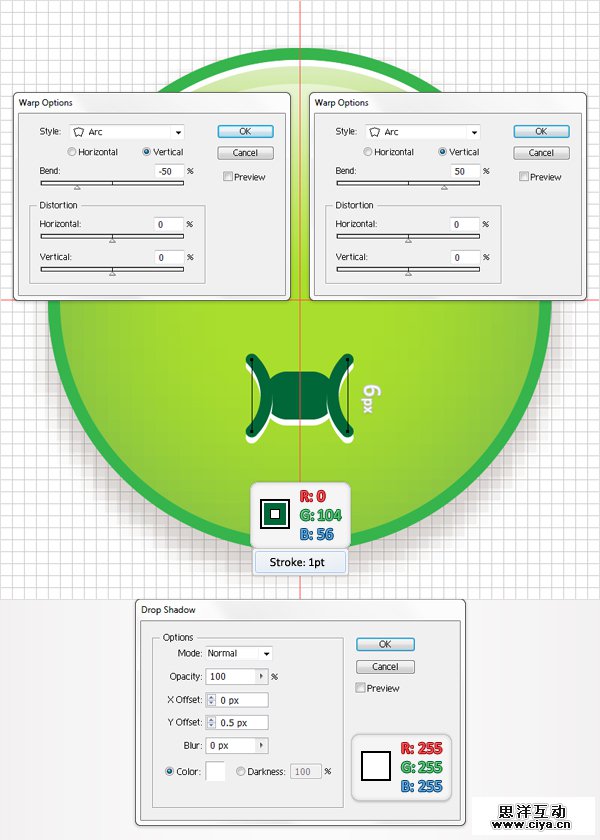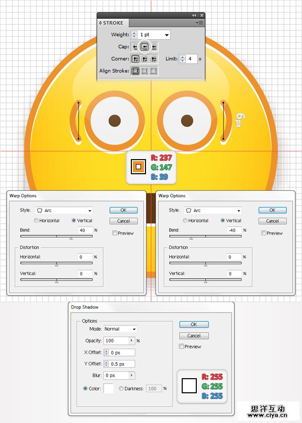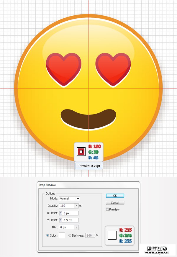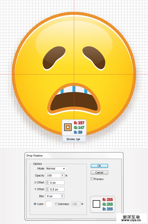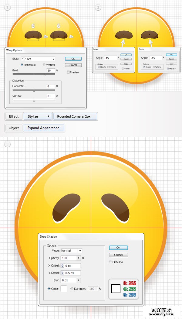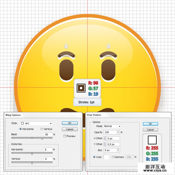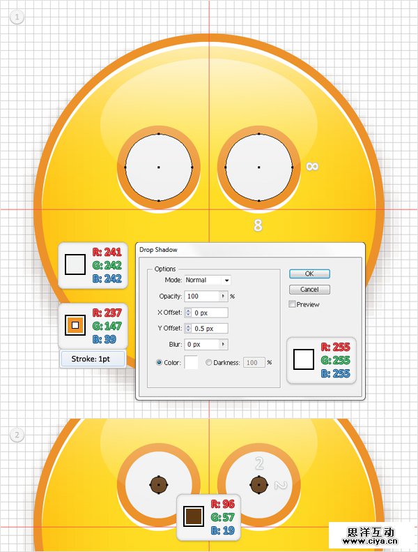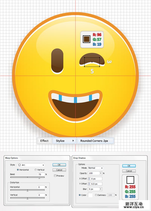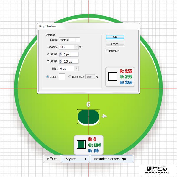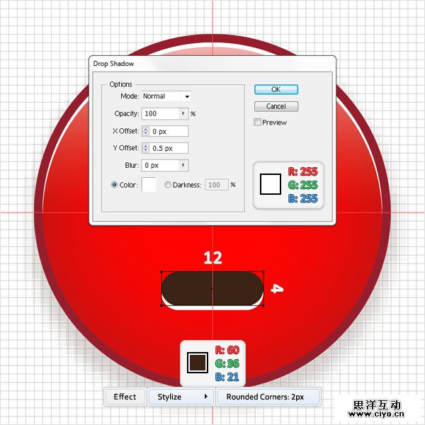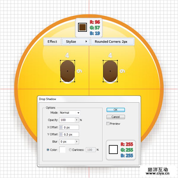 对齐网格会减轻你的工作。 填满所有R = 96,G = 57,B = 19,然后去影响>风格化>圆角。 输入2 px半径,单击确定,然后去>风格化>阴影效果。 输入数据所示,然后单击确定。