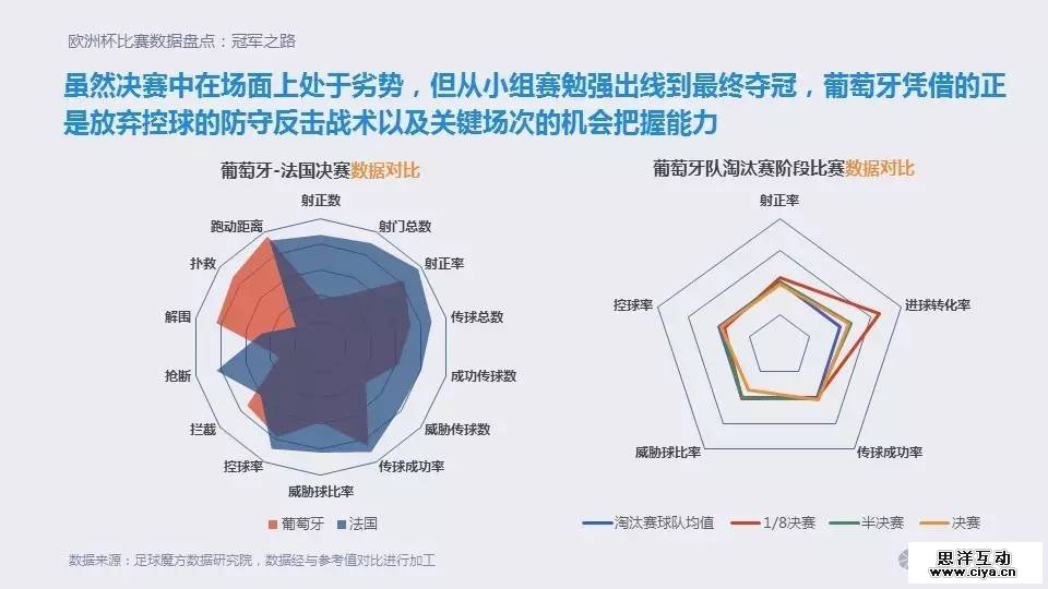 虽然决赛中在场面上处于劣势,多项技术数据落后于法国队,但从小组赛勉强出线到最终夺冠,葡萄牙凭借的正是放弃控球的防守反击战术以及关键场次的得分机会把握能力。淘汰赛阶段葡萄牙队的进球转化率要高于16强球队平均水平。