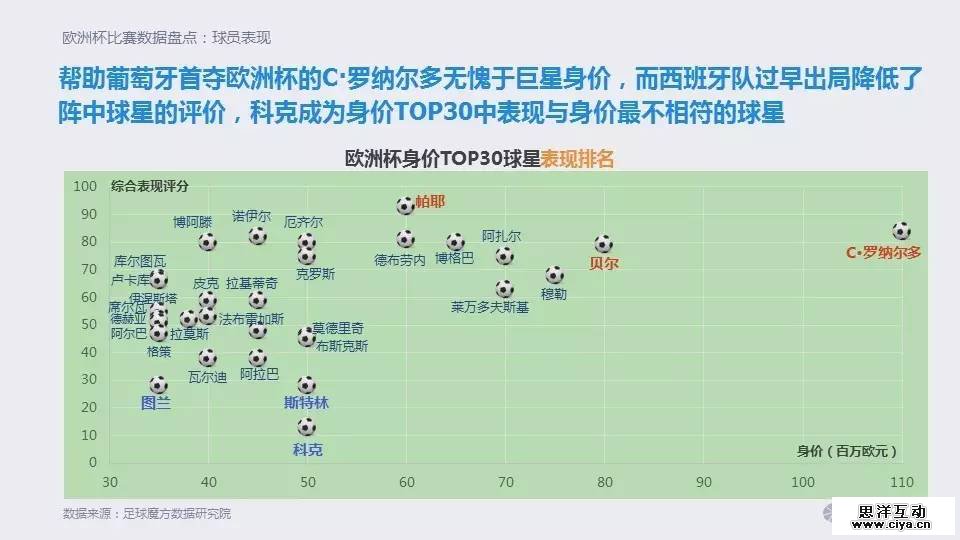 帮助葡萄牙首夺欧洲杯的C·罗纳尔多无愧于巨星身价,而西班牙队过早出局降低了阵中球星的评价,科克成为身价TOP30中表现与身价最不相符的球星。