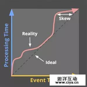 理想化的情况下,事件时间和处理时间应该总是相同的,即事件在它发生的同时就被处理了。但现实是残酷的,处理时间和事件时间之间的偏移不仅是非零的,还经常是由多种因素(如输入源、处理引擎和硬件)的特性所共同组合成的一个可变方程。可以影响这个偏移的因素包括: