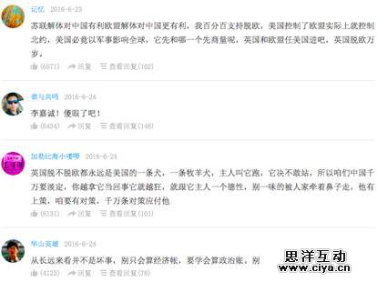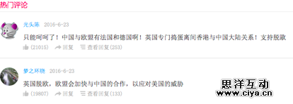 内容影响力排在第二的腾讯新闻并不逊色。腾讯国际新闻发布文章《英国脱欧成功,对中国会产生什么影响?》,获得17668条评论(图4)。多数网民表示支持英国脱欧,其中一条支持脱欧的热门评论点赞量高达21015。腾讯独家评论栏目“今日话题”发布文章《英国脱欧公投:“民粹主义”全球盛行的缩影》,获得2902条评论,在公投结果出来之前就有预见性地分析了整体形势。“今日话题”发布文章《英国脱欧:精英主义的历史性溃败》,获得3231条评论。