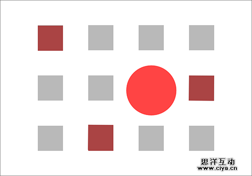 矩形中有三个矩形也是红色的,虽然不是鲜红(和圆比起来)。图片中红色的矩形和灰色的矩形在尺寸上都是相同的,但由于颜色不同,红色矩形相比灰色矩形更为显眼。