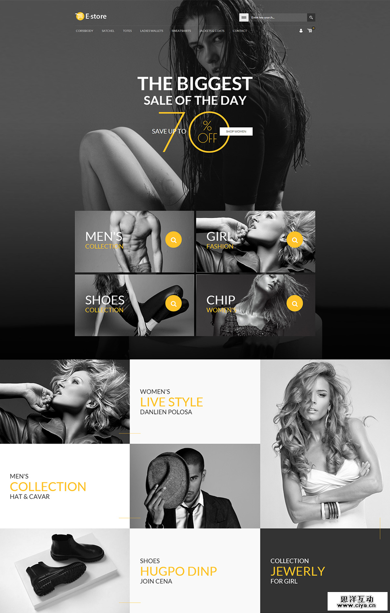 通过提取出的颜色我们可以看到,上面的页面设计中采用了黑白灰做为主色调,使用亮黄色为辅色,虽然亮黄色为辅色,但是人们第一眼往往会注意亮黄色,而设计师把70%off的折扣信息的字体颜色选为亮黄色也是对折扣信息的强调。