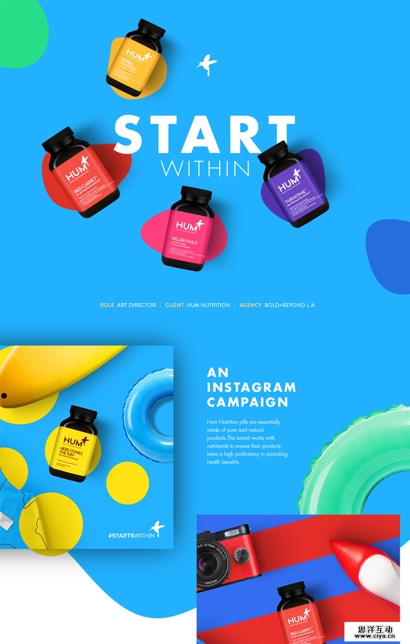 通过上面的案例我们发现,这些设计师所用的颜色都不会超过3种,而做为极简设计有时候只使用2种颜色,甚至只用黑白灰的变化来进行设计。