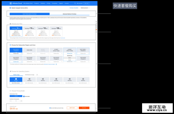 (2)在购买部分,将原先复杂的购买根据用户的类型拆分重构为“快速套餐购买”(将“实例型号” “网络、带宽”“存储”等进行打包,给用用户推荐方案)和“自定义高级购买”两种方式,满足不同级别用户不同的需求,同时也平衡了不同级别用户的能力与挑战(促成心流体验的产生)。