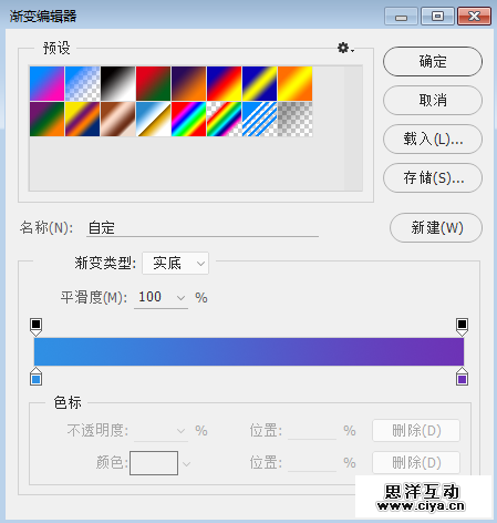 在【渐变叠加】面板中双击‘“渐变条”调出渐变编辑器调整蓝色到紫色的渐变效果。