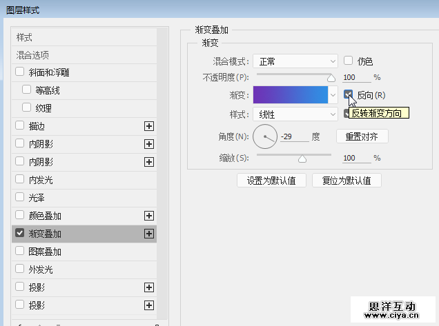 将圆形调整到合适的大小后,再双击图层调整渐变为方向为反响,从而加强两个圆形之间的层次效果。