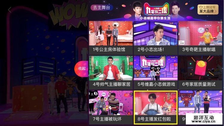 什么?你问我直播和次元壁有什么关系?呵呵,“九牛与二虎”可不是普通的直播,而是一次从直播形态到界面设计都全新的尝试。消费者看到的也不仅仅是一个单一的直播场景,而是整整9个房间同时直播给你看!这下好了,一个都看不过来,9个咋整?别担心,设计师精心构建了全新的交互形式,将9大品牌、9大网红以九宫格的形式铺在你面前,可以快速点击跳转到想看的房间。