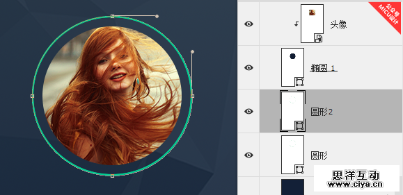找一张照片素材Ctrl+T缩放发到合适的大小,按住Alt键在照片与圆形形状图层中点击,添加剪切蒙版。