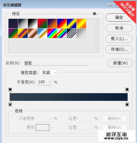 双击渐变条,打开“渐变编辑器”面板,调整渐变条为白色到深色的过度效果。