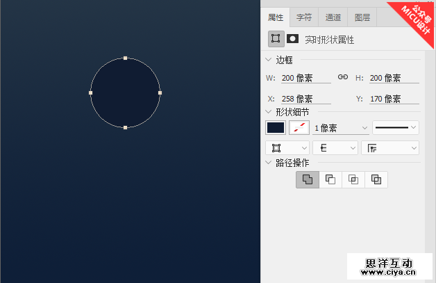 使用工具栏中的【椭圆工具】绘制一个200x200的正圆形。
