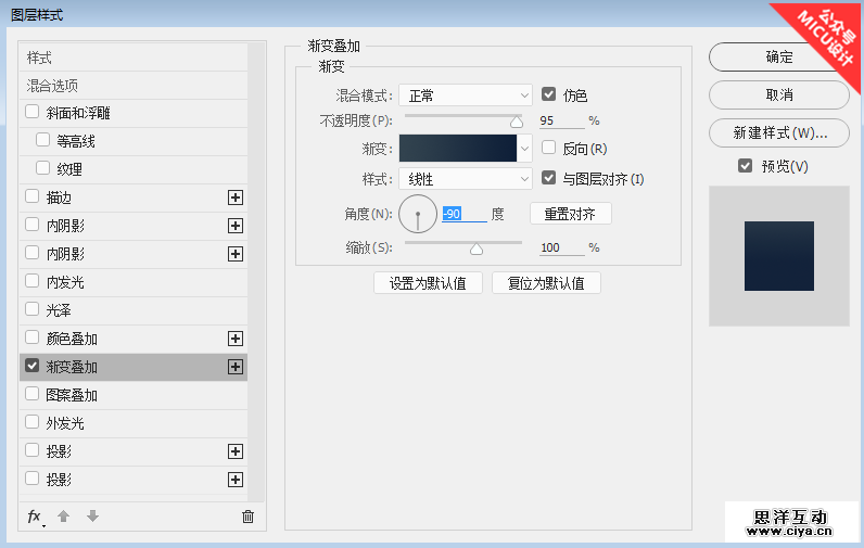 然后新建一个图层并双击图层,在【图层样式】中选择【渐变叠加】,“混合模式”为正常,“样式”为线性,“角度”为-90度。